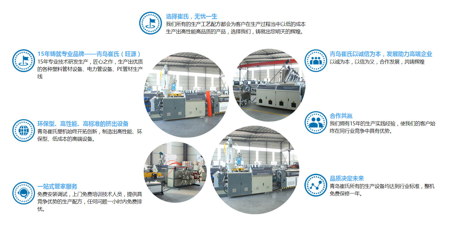 青島崔氏塑料機械有限公司位于青島膠州市膠西工業園區,香港路與同三高速交匯處,距膠東國際機場20多公里,地理位置便利,占地面積20000多平方米,是一家集生產與研發(fā)各種塑料制品設備的環(huán)保型企業。我公司主營預應力波紋管設備、雙壁波紋管設備、電力管設備、塑料波紋管設備、汽車線束波紋管設備、PPR、PE、PVC、PERT管材設備及其它各種管材設備、塑料型材設備、塑料蜂窩板設備。公司技術力量雄厚,開發(fā)能力強,生產工藝先進,以開發(fā)新材料,研制新工藝為基礎生產各種塑料擠出設備。公司產品遍布全國各地,并且遠銷歐州,獨聯體,南美洲,中東,東南亞,大洋州,非洲等許多國家和地區。